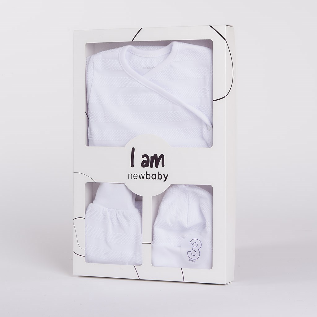 Uroczy 3-częściowy komplet New Baby I AM dla niemowląt. Komplet wykonano z niezwykle przyjemnego i miękkiego materiału wysokiej jakości, który jest odpowiedni dla niemowląt. Przyda się nie tylko do szpitala. Na zestaw składa się body z długim rękawem z zapięciem na całej długości, półśpioszki oraz czapeczka. Body zapinane jest na zatrzaski – zapięcie znajduje się na boku na całej długości oraz między nóżkami. Półśpioszki mają w pasie szerszą elastyczną lamówkę, która nie uciska brzuszka dziecka. Czapeczka z szerszą lamówką dobrze trzyma się na główce i z niej nie spada. Jest bardzo praktyczna i nie uciska głowy maluszka. Komplet został wykonany z nowego, ciekawegoi oryginalnego materiału. Zaprojektowano go, uwzględniając potrzeby niemowlęcia. Będzie odpowiedni również jako prezent. Produkt pakujemy w praktyczne ekologiczne pudełko. Skład: 100% bawełna.