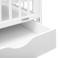 Szuflada jest zawieszona na prowadnicach rolkowych po bokach łóżeczka, można ją całkowicie wyjąć i ponownie włożyć, nie dotyka podłoża.