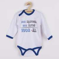 Piękne niemowlęce body z długim rękawem New Baby, z śmiesznym napisem 50% MAMUSIA + 50% TATUŚ - 100% JA. Body jest z lemem wokół szyi, rączek i nóżek. Barwniki używane do druku są certyfikowane i nadaje się dla niemowląt. Zapina się na napy na ramieniu i między nóżkami. Jest wykonane z miękkiej, wartościowej materii. Idealne dla niemowląt. Materiał: 100% bawełna. Rozmiary: obwód wokół piersi 40 cm, długość rękawa 22 cm, długość 36 cm.
