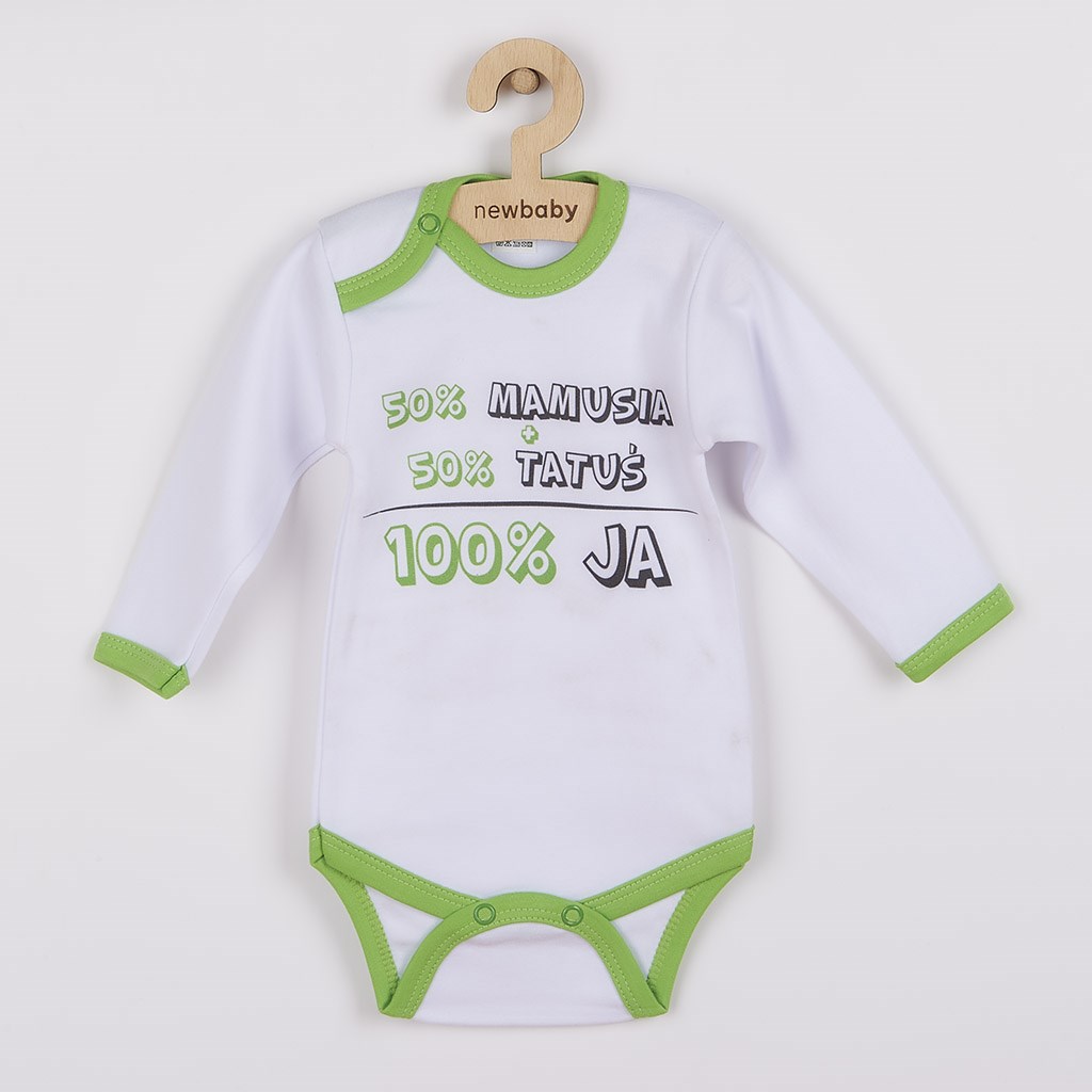 Piękne niemowlęce body z długim rękawem New Baby, z śmiesznym napisem 50% MAMUSIA + 50% TATUŚ - 100% JA. Body jest z lemem wokół szyi, rączek i nóżek. Barwniki używane do druku są certyfikowane i nadaje się dla niemowląt. Zapina się na napy na ramieniu i między nóżkami. Jest wykonane z miękkiej, wartościowej materii. Idealne dla niemowląt. Materiał: 100% bawełna. Rozmiary: obwód wokół piersi 36 cm, długość rękawa 18 cm, długość 32 cm.