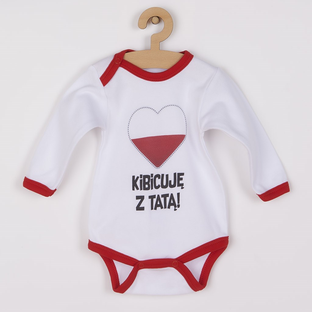 Oryginalne bawełniane body z długim rękawem New Baby, z wesołym napisem Kibicuję z tatą i pięknym obrazkiem polskiej flagi. Body ma kolorową lamówkę. Farby używane do druku są certyfikowane i nadają się dla niemowląt. Body jest wykonane z komfortowego i jakościowe materiału, w którym dziecko poczuje się wygodnie. Zapina się na napy. Ubierz dziecko w oryginalne body. Skład: 100% bawełna. Wymiary: obwód wokół klatki piersiowej 36 cm, długość rękawa 18 cm, długość 32 cm.