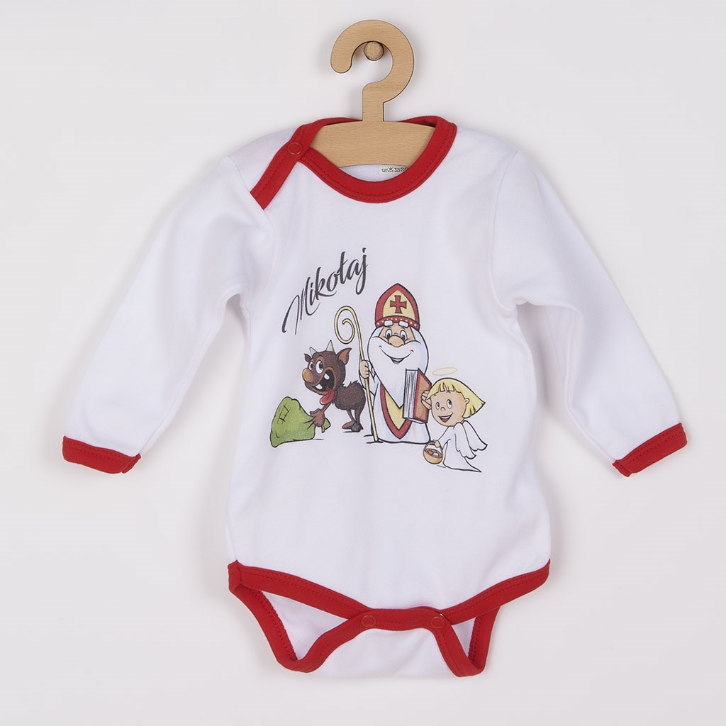 Oryginalne bawełniane body z długim rękawem New Baby, z wesołym obrazkiem i napisem Mikołaj. Body ma kolorową lamówkę. Farby używane do druku są certyfikowane i nadają się dla niemowląt. Body jest wykonane z komfortowego i jakościowe materiału, w którym dziecko poczuje się wygodnie. Zapina się na napy. Ubierz dziecko w oryginalne body. Skład: 100% bawełna. Wymiary: obwód wokół klatki piersiowej 50 cm, długość rękawa 26 cm, długość 42 cm.