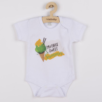 Piękne body z krótkim rękawem New Baby z napisem MY FIRST SWEET Summer i obrazkiem lodów. Wszystkie elementy używane do nadruku są certyfikowane i odpowiednie dla niemowląt. Jest wykonane z miękkiej, wartościowej materii. Zapinanie na napy. Materiał: 100% bawełna.
