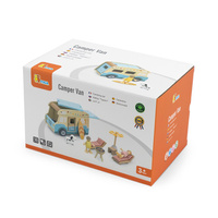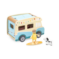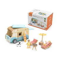 Drewniany Kamper to wyjątkowa zabawka, która przeniesie dzieci w świat wakacyjnych przygód i letnich podróży! Zestaw jest inspirowany beztroskimi wyjazdami nad morze, a dzięki precyzyjnym detalom i realistycznym funkcjom, jak przesuwane drzwi, podnoszony dach, czy bagażnik dachowy na deskę surfingową, zapewnia Dziecku godziny angażującej i kreatywnej zabawy. Kamper posiada bogaty zestaw akcesoriów, w tym dwie lalki, pieska, leżaki z poduszkami, parasol plażowy, grill, a nawet deskę surfingową, co pozwala na odtwarzanie różnorodnych scenariuszy zabawy. Dzieci mogą odgrywać role związane z podróżowaniem, odpoczynkiem na plaży czy organizowaniem pikniku.
