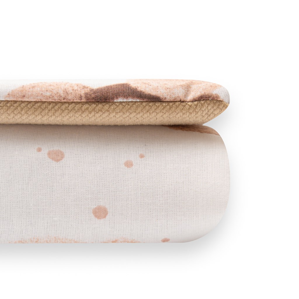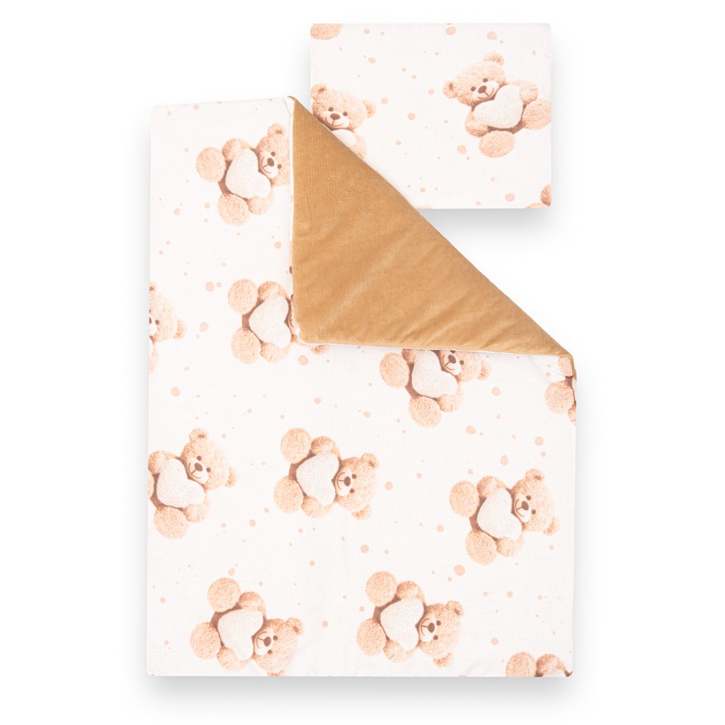 Piękny dwustronny komplet do wózka z Velvet New Baby. Stworzony z dwóch rodzajów tkanin. Bawełniany materiał z nowoczesnym nadrukiem zapewnia komfort dziecka, a materiał Velvet jest bardzo przyjemny w dotyku i przez długi czas zachowuje swój pierwotny kształt. Jest idealny dla niemowląt od momentu urodzenia, ale i dla starszych dzieci jako koc do zabawy, do wózka lub na zewnątrz. Zestaw zawiera poduszkę i kołderkę. Zwracamy ogromną uwagę na jakość, dlatego zestaw z Velvet wykonany jest z materiału wysokiej jakości, który nie farbuje i nie wywołuje reakcji alergicznych. Jest mięciutki w dotyku, ciepły, przytulny, wyjątkowy i bardzo różni się od wszystkich innych. Wypełniony włóknem antyalergicznymi. Skład: jedna strona 100% bawełny z nadrukowanym pięknym wzorem, druga strona to tkanina Velvet - 100% poliester, wypełnienie - 100% antyalergiczne włókno. Materiał odpowiada normie Oeko-Tex Standard 100. Wymiary: poduszka: ok. 30x25 cm, kołderka: ok. 75x50 cm.