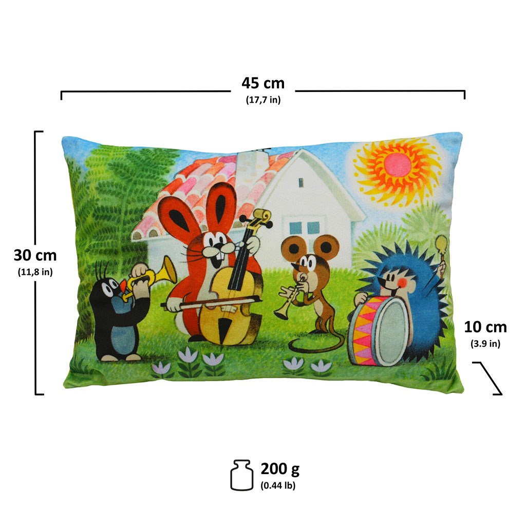 Mieciutka poduszka z motywem ulubionego Krecika, odpowiednia do łóżeczka, w podróży oraz jako dekoracja do pokoju dziecięcego. Materiał: mikrowelur, obrazek: nadruk, wypełnienie: włókno pustek. Pranie w 30°C, 100% poliester. Ręcznie wykonane w Czechach. Dla dzieci bez ograniczeń wiekowych. Bezpieczna zabawka, certyfikowana zgodnie z normami EN-71.