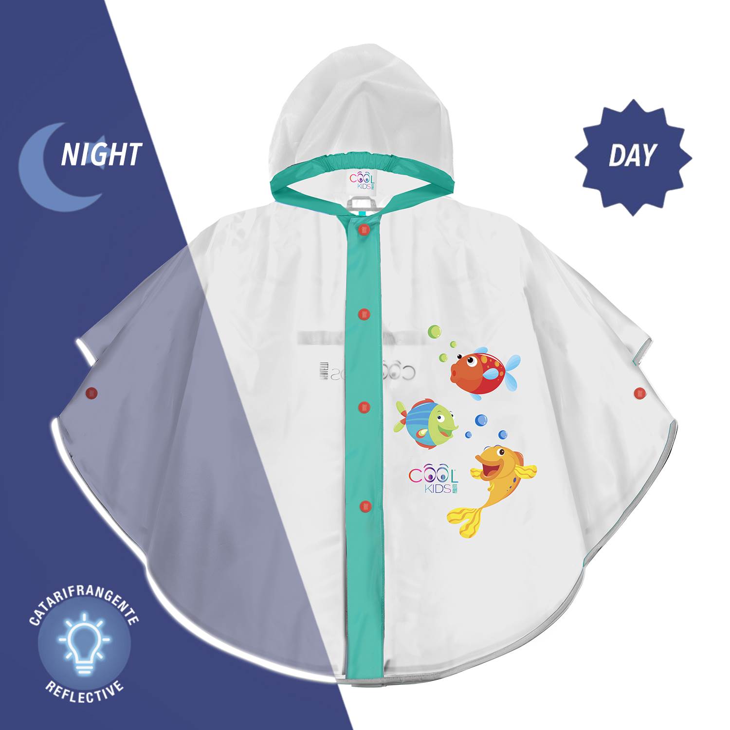 Ponczo uzupełniają elementy odblaskowe, widoczne jest dziecko również w ciemności.