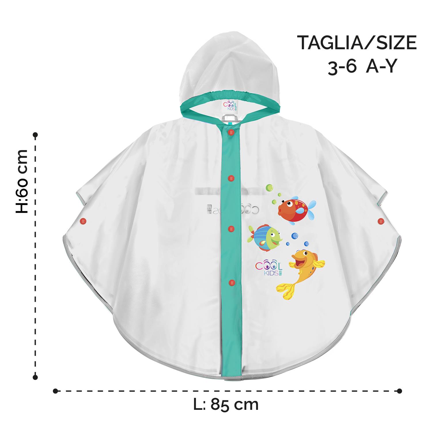 Dziecięcy płaszcz przeciwdeszczowy w kształcie poncza z motywem rybek.