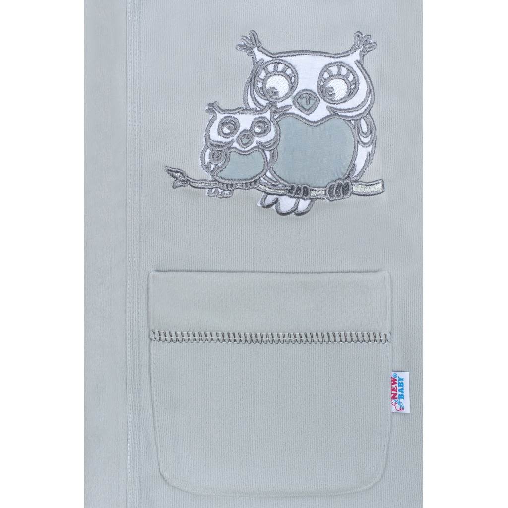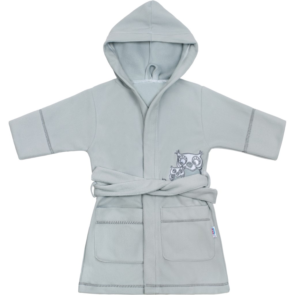 Dziecięcy szlafrok New Baby Sówki. Ma obrazek sówek, kaptur i kieszenie. Zawiązuje się na sznurki. Rozmiar: długość 68 cm, obwód wokół klatki piersiowej 82 cm,długość rękawa 35 cm. Skład: 100% poliester.