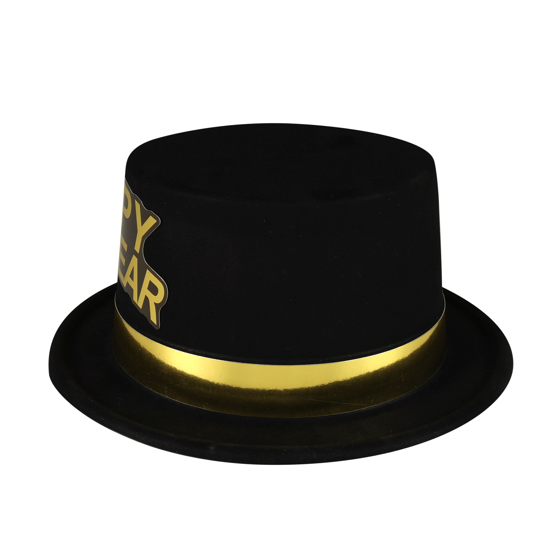 Czarny kapelusz ze złotym wykończeniem i napisem HAPPY NEW YEAR to rewelacyjny dodatek na noworoczną uroczystość lub imprezę!