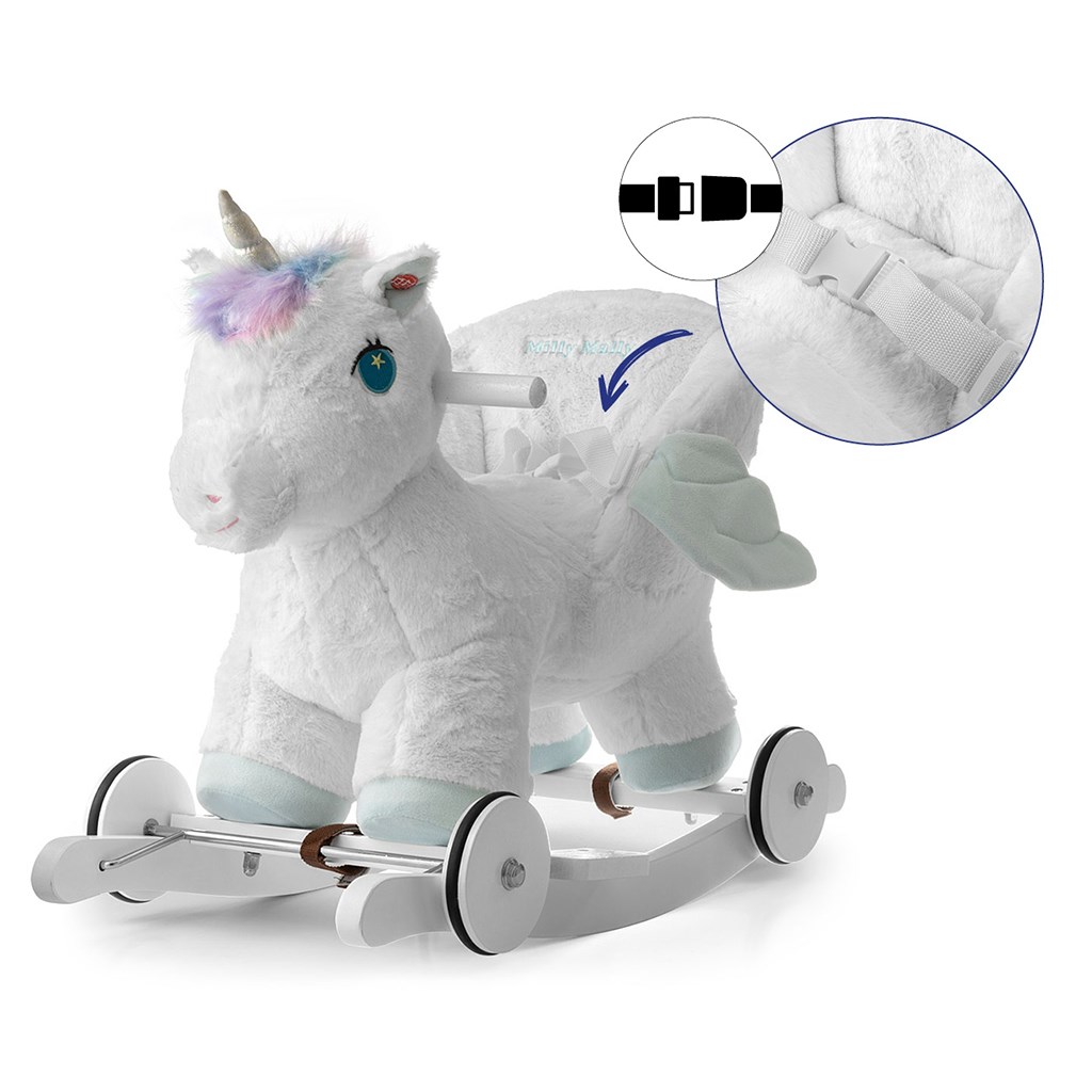 Mięciutki konik na biegunach Polly zaprojektowany został z myślą o najmłodszych dzieciach (12m+) dla których tradycyjne koniki na biegunach są za duże. Wygodne, wyprofilowane siedzisko w kształcie kanapy i regulowane pasy zapewnią komfort i bezpieczeństwo podczas beztroskiego bujania i przemieszczania maluszka.