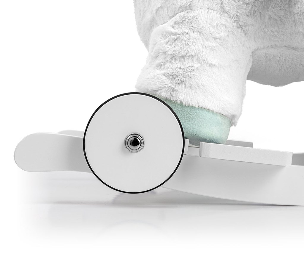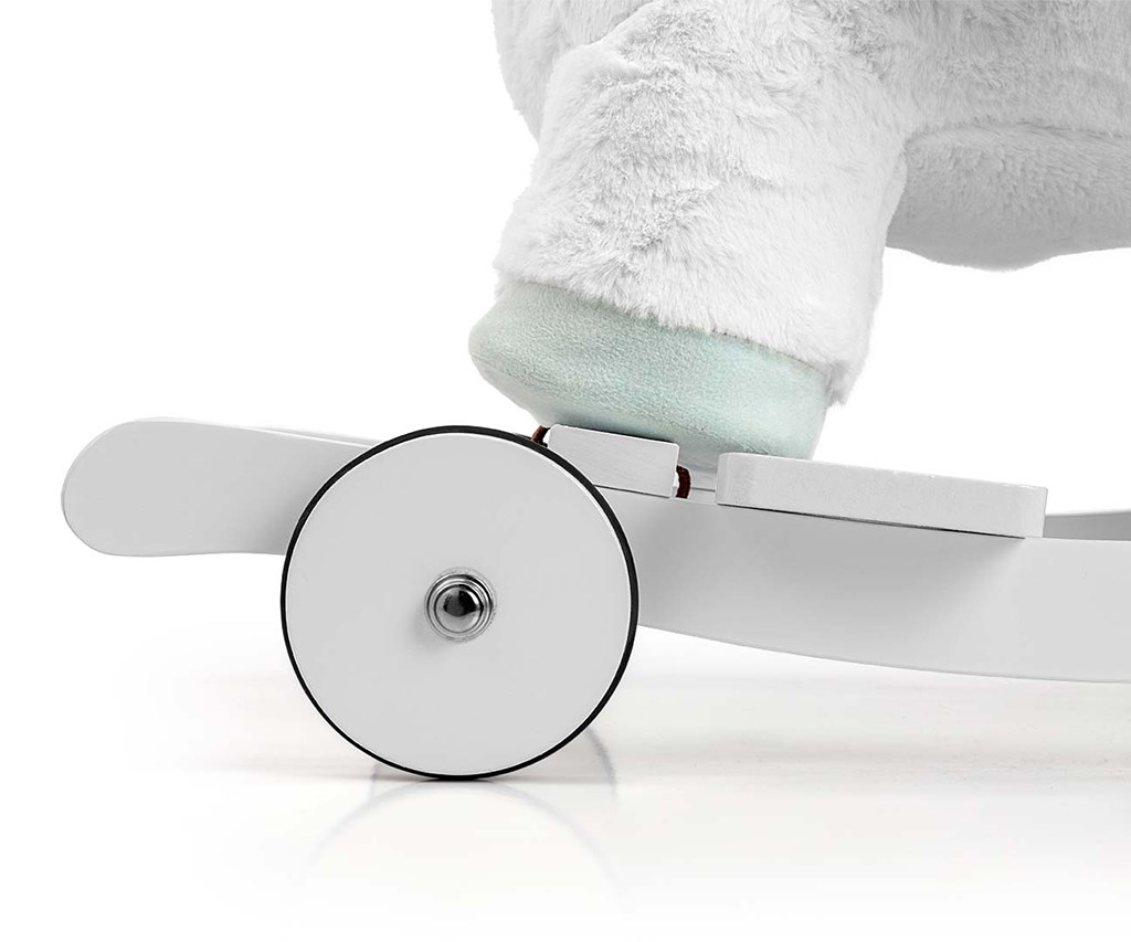 Konik posiada drewniane bieguny z podnóżkami i rączki, które pomogą zachować równowagę podczas zabawy oraz zestaw składanych kółek, dzięki którym w kilka sekund można zamienić go w cudowny pluszowy pojazd.
