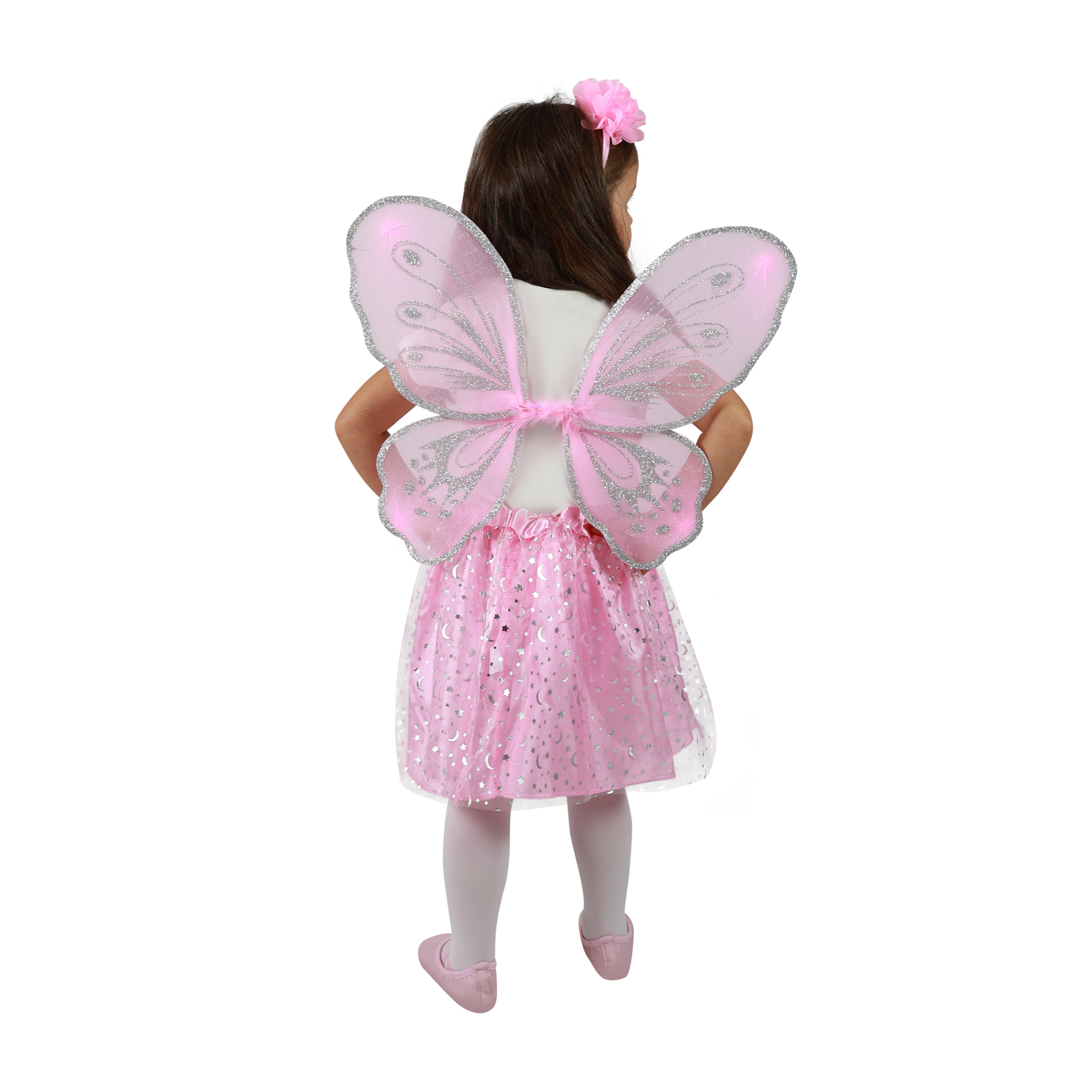 Piękny zestaw wróżki dla małych dziewczynek! Zestaw zawiera skrzydełka ze srebrną lamówką, różową sukienkę tutu z satynową lamówką i srebrnym nadrukiem gwiazdek i księżyców. Całość uzupełnia magiczna różdżka wróżki. Spódniczka ma około 25 cm długości i jest odpowiednia dla obwodu talii 44-72 cm.