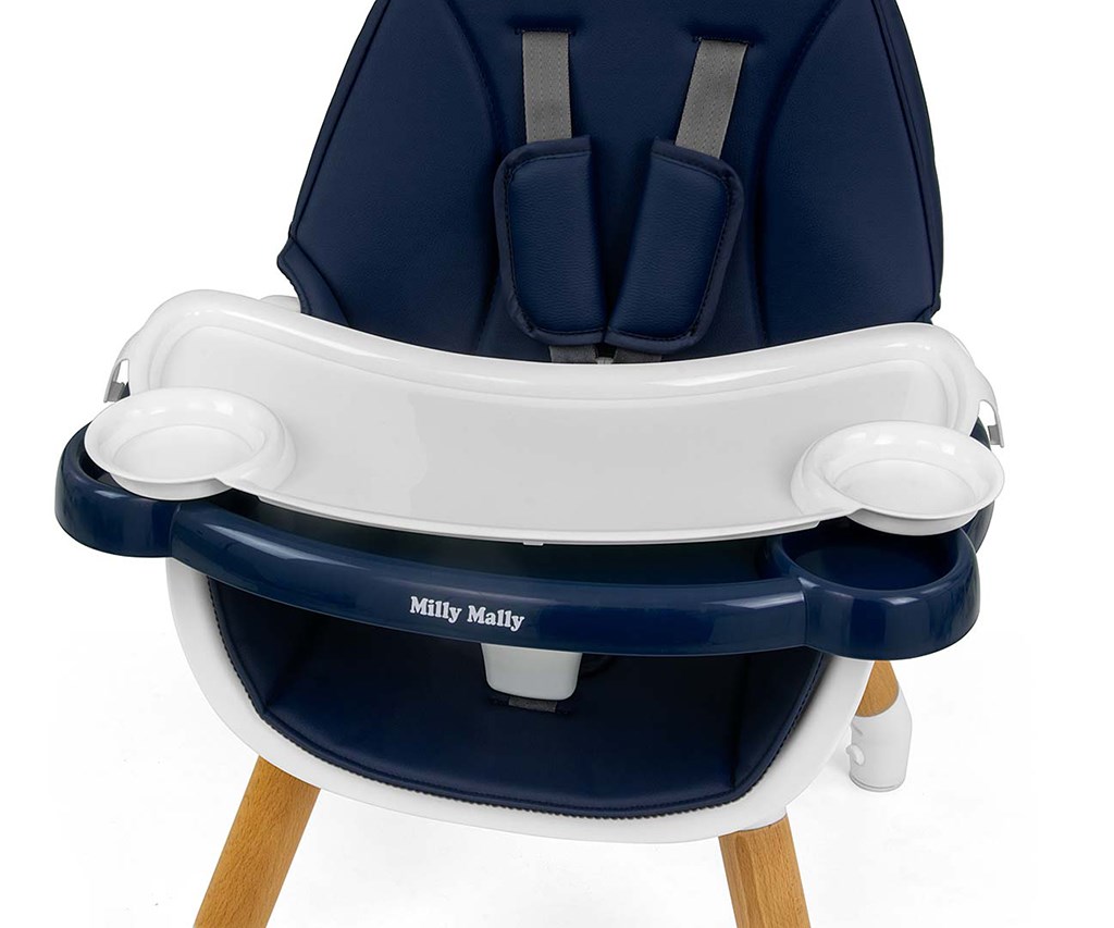 5-punktowe pasy bezpieczeństwa wyposażone w szerokie i miękkie osłonki na ramiona, zabezpieczają dziecko przed otarciami. Tapicerka krzesełka Malmo wykonana z ekoskóry jest odporna na zabrudzenia i łatwa w utrzymaniu czystości. Tacka posiada wgłębienie, które zapobiega zsunięciu się przedmiotów na niej umieszczonych.