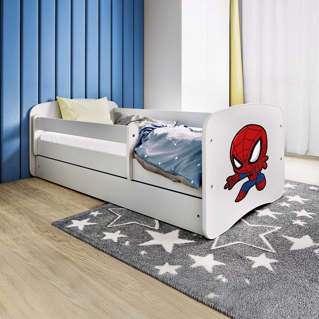 Łóżko pojedyncze z barierką jest wykonane z wysokiej jakości płyty meblowej o grubości 18 mm. Dostępne jest w kilku rozmiarach i wariantach kolorystycznych. Bajkowe wzory zapewniają szeroki wybór i możliwość personalizacji.