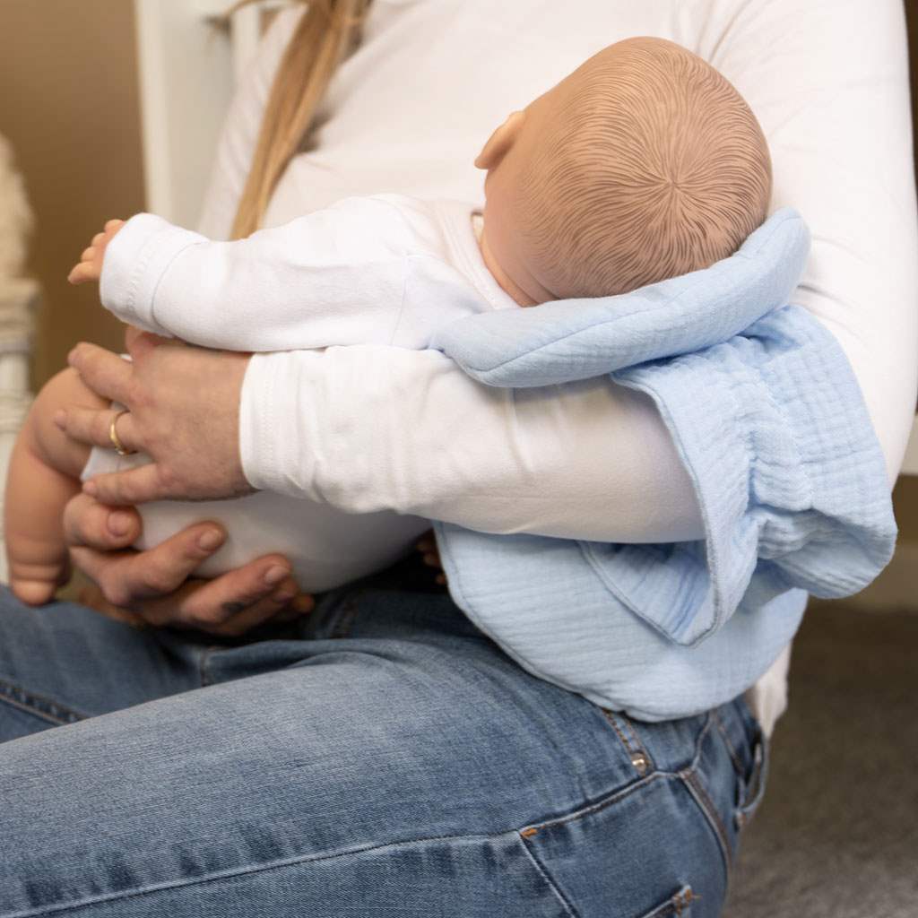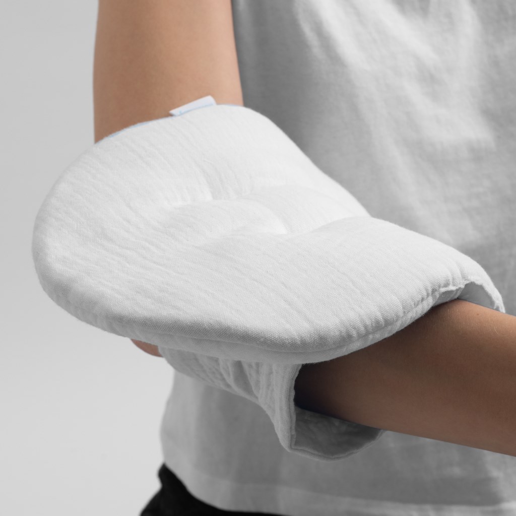 Nakładka na rękę doskonale sprawdzi się podczas karmienia oraz usypiania dziecka. Założona nakładka stanowi miękka podporę dla główki oraz zapobiega kontaktu z ciałem opiekuna co ogranicza występowanie potówek na główce i karku malucha. Nakładka wykonana jest z lekkiego, przewiewnego, oddychającego muślinu, który posiada właściwości termoregulacyjne, bardzo dobrze chłonie i odprowadza wilgoć.