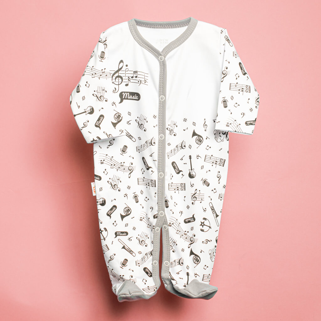 Oryginalny, elegancyjny bawełniany pajac New Baby Music dla niemowląt. Pajac jest jednokolorowy z obrazkiem nut, instrumentów muzycznych i napisem Music. Zapina się na napy po całej długości. Nowoczesny design przystanie wszystkim małym dzieciom. Bardzo przyjemny, miękki i wysokiej jakości materiał. Skład: 100% bawełna. Wymiary: obwód klatki piersiowej 46 cm, długość całkowita 45 cm, długość od krocza 15 cm, długość rękawa 17 cm.