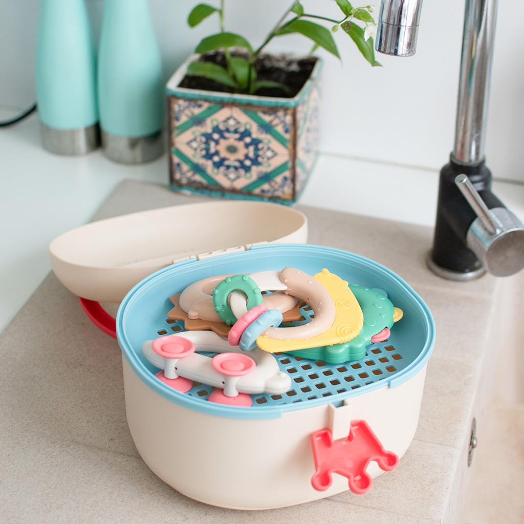 - w środku znajduje się specjalna kratka, która z jednej strony umożliwia suszenie zabawek po umyciu, z drugiej strony może spełniać funkcję sitka do przesiewania piasku podczas zabawy w piaskownicy,