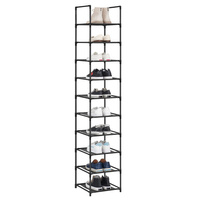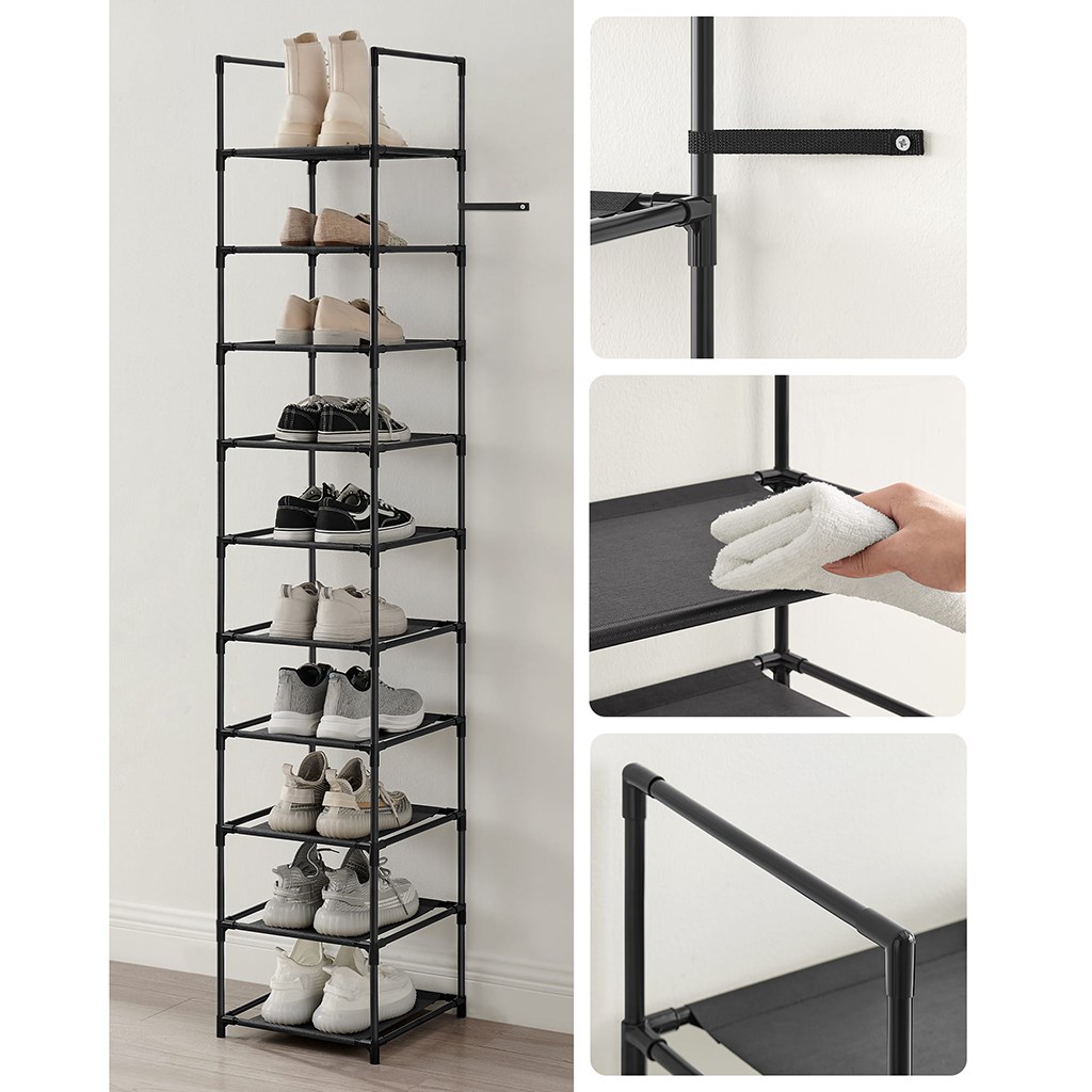 Regał posiada 10 półek na buty, które w zależności od wielkości obuwia mogą pomieścić ich do 10 par.