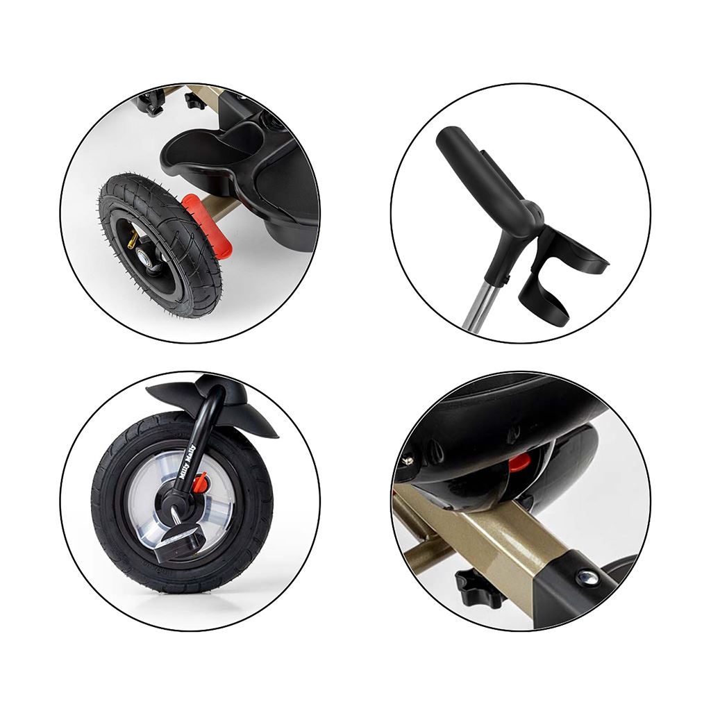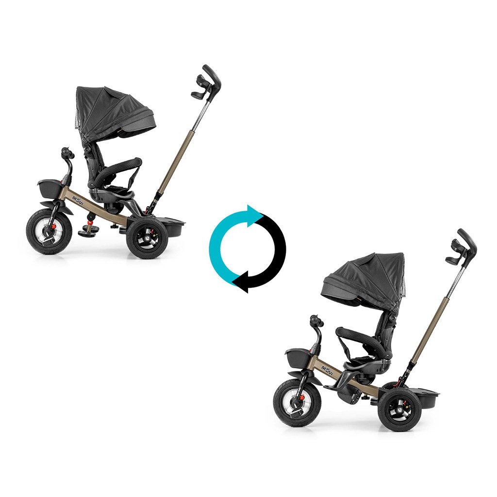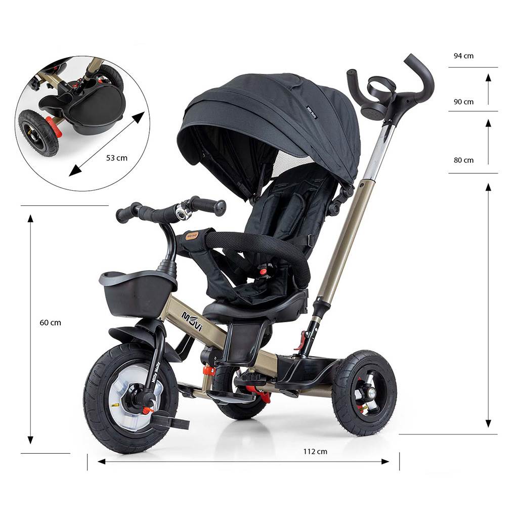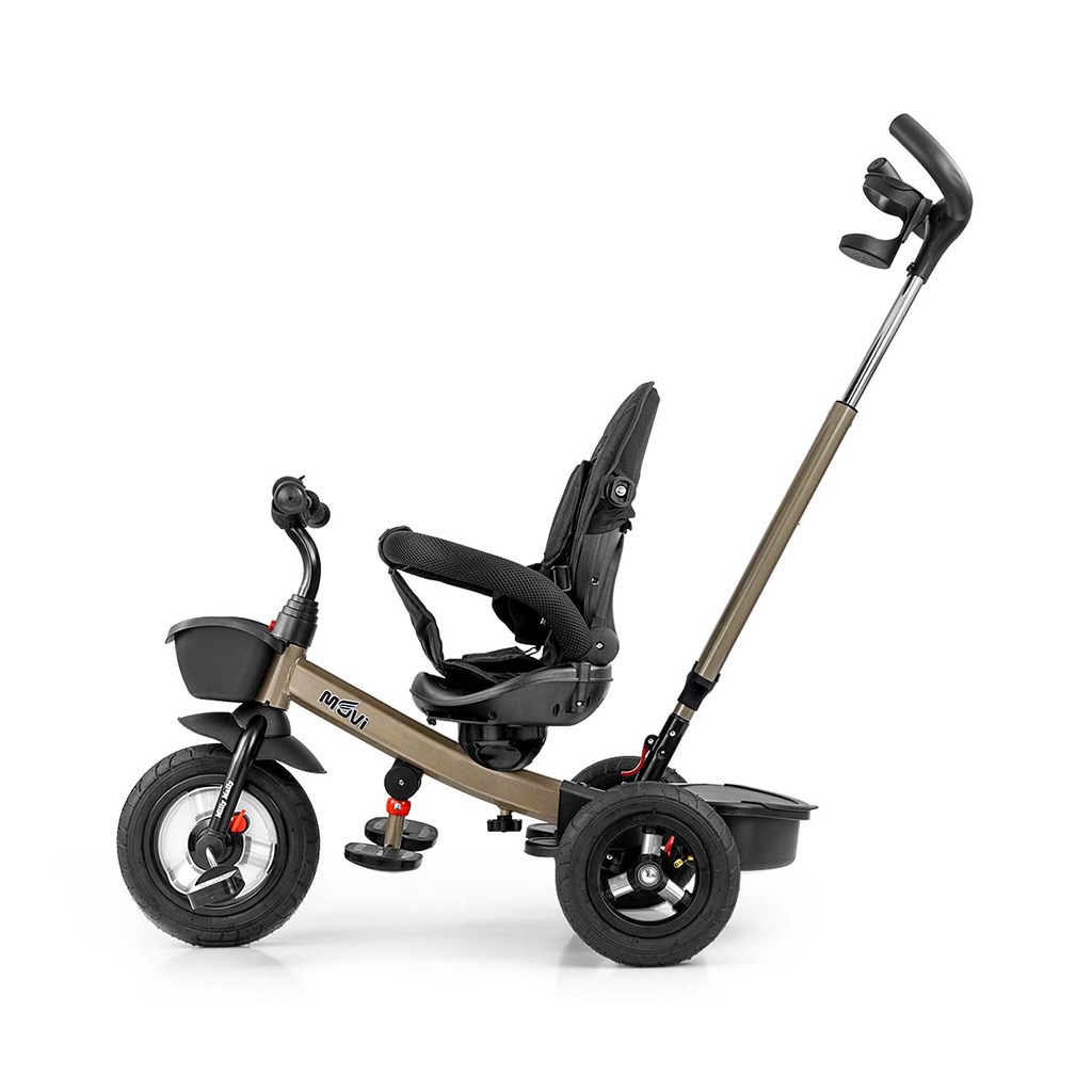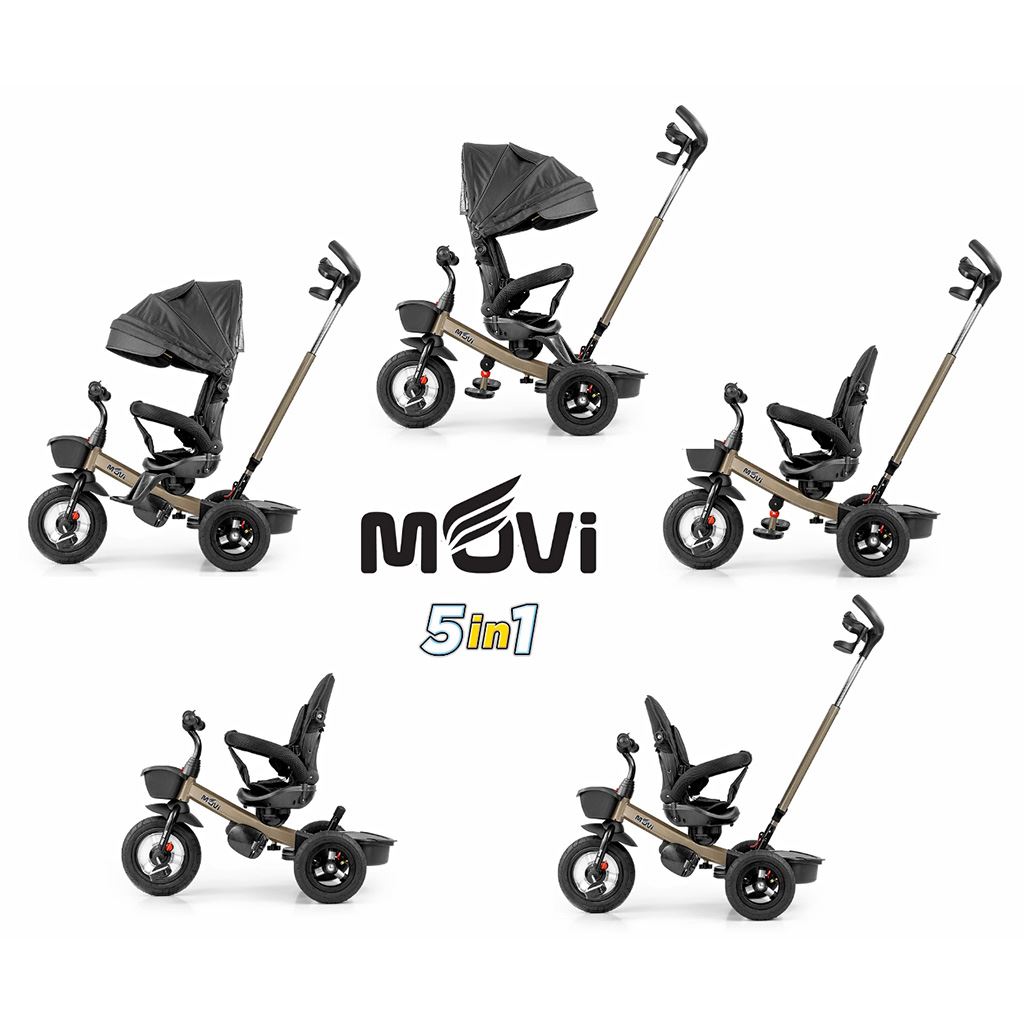 MOVI jest stabilny i bezpieczny, posiada nowoczesną konstrukcję, wygodne wyprofilowane obracane o 360 stopni siedzisko, które umożliwi podróż przodem lub tyłem do kierunku jazdy. Rowerek został wyposażony w barierkę zabezpieczająca dziecko przed wypadnięciem, trzypunktowe pasy bezpieczeństwa oraz podnóżki a pompowane koła umożliwiają cichą i komfortową jazdę. Po zdemontowaniu rączki, barierek, budki i pokrowca na siedzisko MOVI będzie służył jako rowerek trójkołowy. Dzięki funkcji „wolnego koła” dziecko może swobodnie pedałować, a kierownica dla rodzica nadal może korygować prędkość przemieszczania.