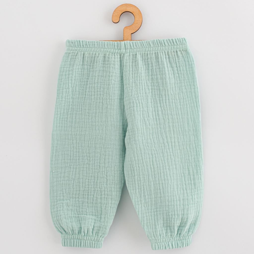 Stylowe i praktyczne spodnie New Baby Feeling. Spodnie są wykonane z przyjemnego muślinu zostaną docenione zarówno na co dzień, jak i na różne okazje, dzięki bardzo ciekawej strukturze materiału. Dla komfortu ubierania spodnie posiadają wszytą gumkę w pasie i nogawkach. Skład: 100% bawełna. OEKO-TEX STANDARD 100.