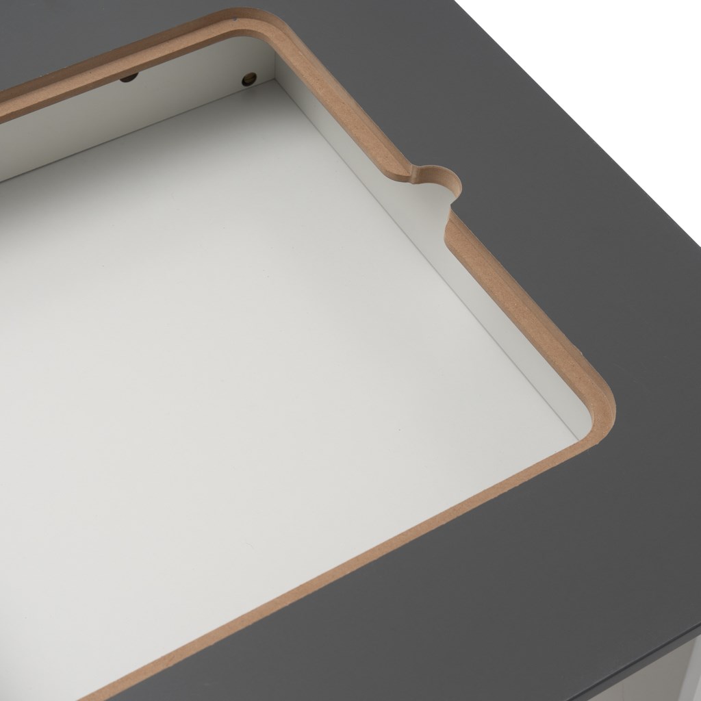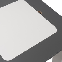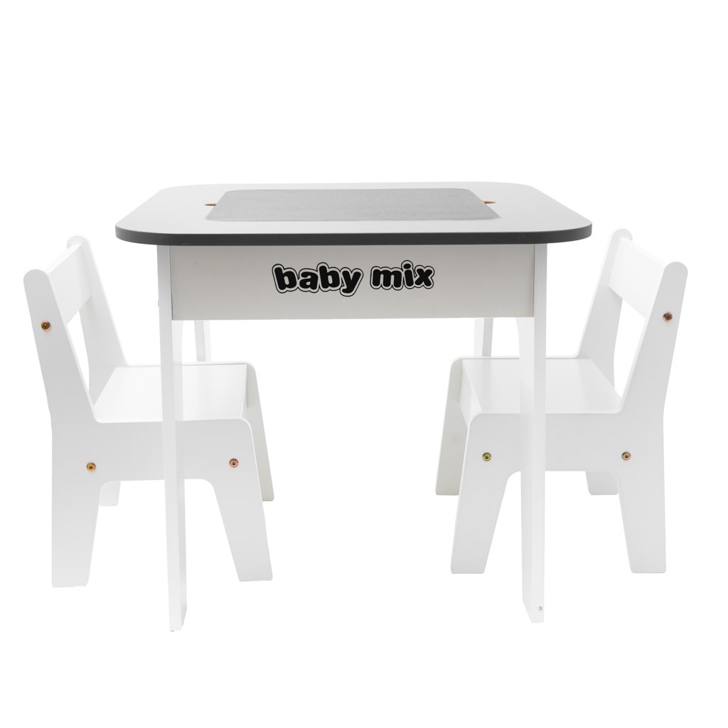 W skład zestawu wchodzi stół oraz dwa krzesełka wykonane z trwałego materiału, który zapewnia stabilność i długotrwałe użytkowanie. Stół posiada praktyczny, zdejmowany blat – pod nim znajduje się schowek, do którego można łatwo schować kredki, papier, drobne zabawki czy klocki. Dzieci mają wszystko pod ręką i uczą się utrzymywać porządek.