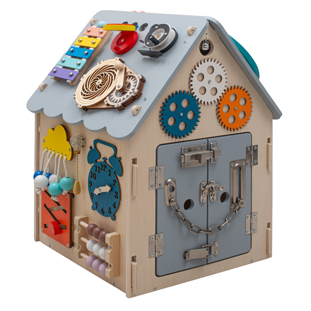 Domek Montessori Baby Mix został zaprojektowany z myślą o wszechstronnym rozwoju dziecka – wspiera rozwój motoryki, logicznego myślenia, kreatywności oraz praktycznych umiejętności codziennego życia. Cztery ściany oraz dach wyposażono w różnorodne ruchome i sensoryczne elementy, które zachęcają do eksploracji.