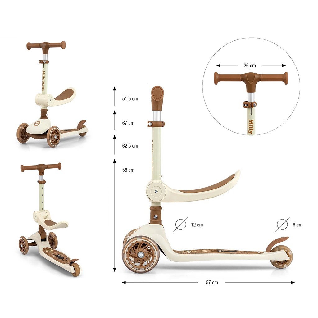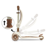 Hulajnoga FUZZY rośnie razem z dzieckiem i dostosowuje się do jego potrzeb. Najpierw służy jako jeździk z siedziskiem, później jako klasyczna hulajnoga balansowa.
