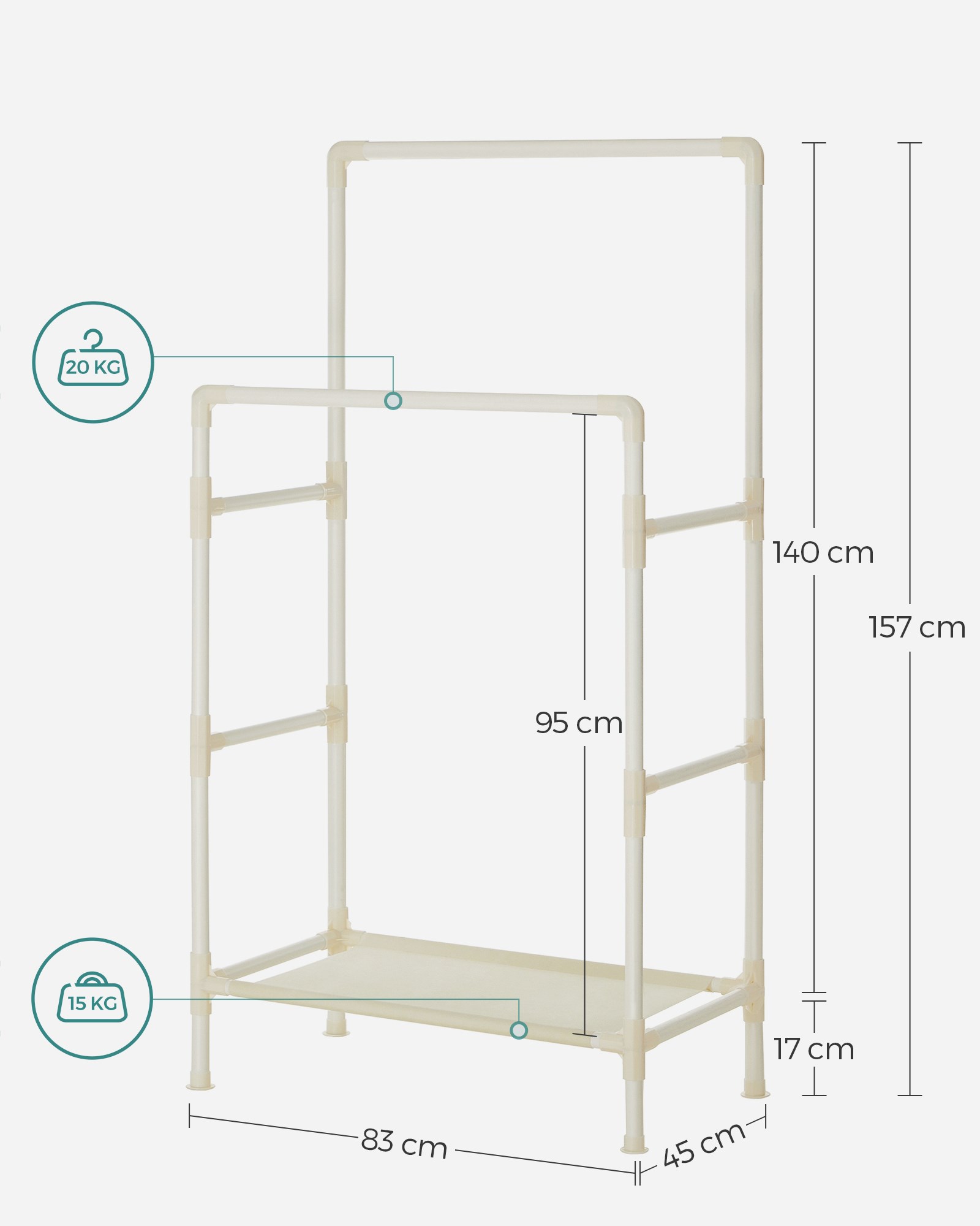 Stojak posiada 2 bardzo stabilne i wytrzymałe drążki, które służą do przechowywania płaszczy, kurtek, sukienek, koszul oraz marynarek. Ponadto na drążku możemy wieszać szale, szaliki czy też kominy. Jest on szczególnie przydatny w sezonie wesel i komunii, gdzie potrzebujemy zdjąć z wieszaka perfekcyjnie wyprasowane koszule czy sukienki.