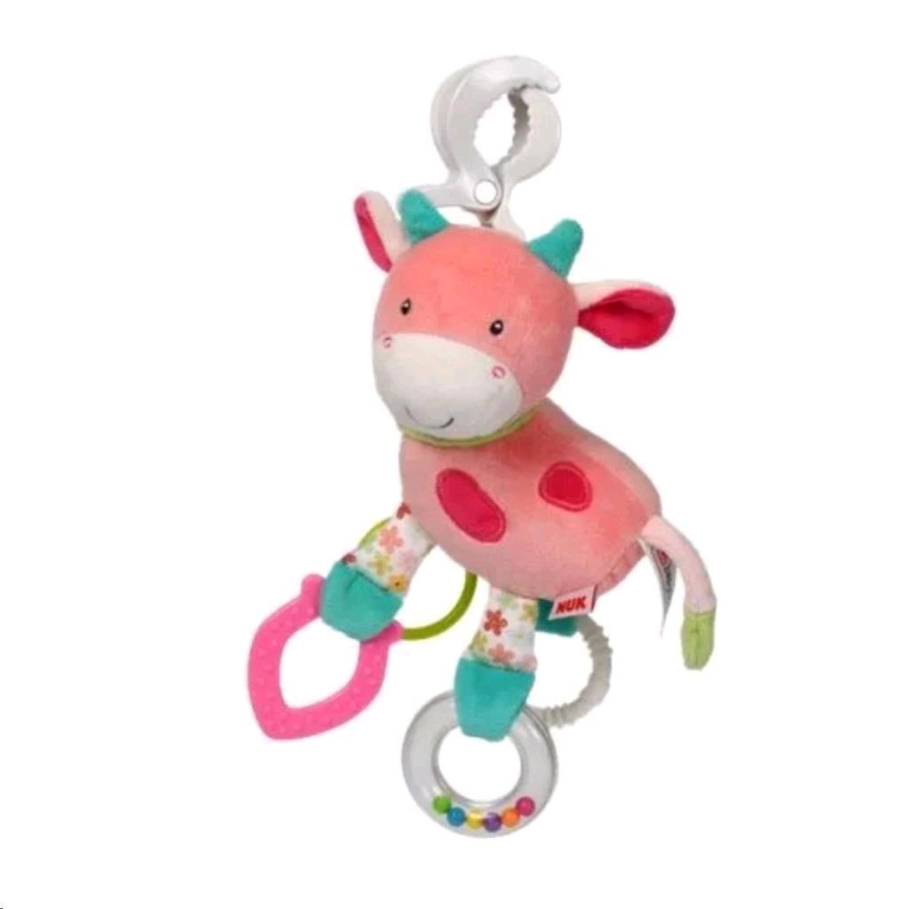 Piękna, kolorowa zabawka z klipsem Nuk Happy Farm Krówka. Kto dobrze się bawi, nie złości się. To fakt. Zapewnij dziecku przyjaciela, który będzie mu towarzyszył od pierwszych chwil. Pluszowa zabawka dla dzieci NUK z klipsem to wesoła i miękka przytulanka, która posiada wbudowaną grzechotkę i pierścienia do mocowania w wózku, łóżeczku lub kołysce. Dodatkowo pomaga przy ząbkowaniu oraz wspomaga rozwój zmysłu dotyku. Zabawka składa się z różnych powierzchni, szeleszczącej tkaniny i lusterka. Dzięki klipsowi w bardzo łatwy sposób można przymocować ją do wózka, łóżeczka czy fotelika samochodowego. Zabawka wykonana jest z przyjemnego materiału - poliestru. Odpowiednia dla dzieci od urodzenia.