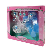 Zamień się w prawdziwą księżniczkę! Ten piękny zestaw zawiera wszystko, czego mała księżniczka potrzebuje do swoich bajkowych przygód. Eleganckie warkocze, korona, kolczyki, pierścionek i magiczna różdżka. Dzięki połączeniu srebrnego i niebieskiego koloru, cały zestaw wygląda bardzo świątecznie i czarująco. Nadaje się nie tylko do zabawy w domu, ale także na karnawały, przyjęcia urodzinowe lub imprezy dla dzieci.