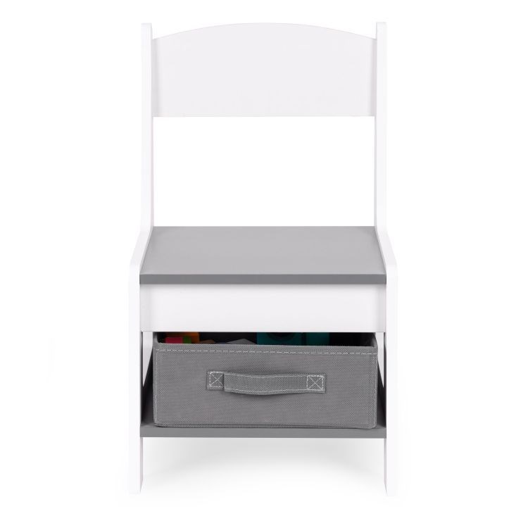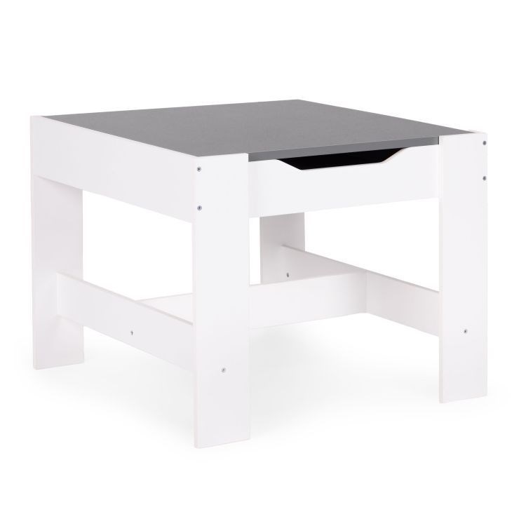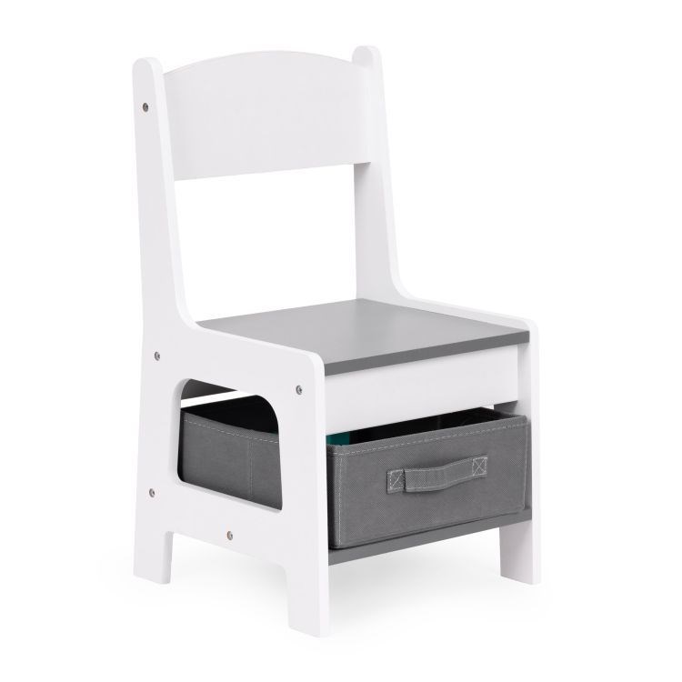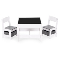W skład kompletu wchodzą 2 krzesła i stolik. Zestaw posiada wytrzymałą i stabilną konstrukcję z płyty MDF. Stolik wyposażono w dwustronny, zdejmowany blat z tablicą kredową. Pod blatem znajduje się funkcjonalna przestrzeń do przechowywania klocków, zabawek lub innych drobiazgów. Pod siedziskami krzeseł umieszczono pojemne, tekstylne szufladki idealne do przechowywania zabawek. Komplet świetnie sprawdzi się w pokoju dziecięcym, salach zabaw czy poczekalniach.