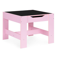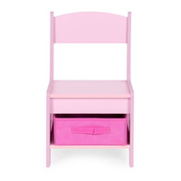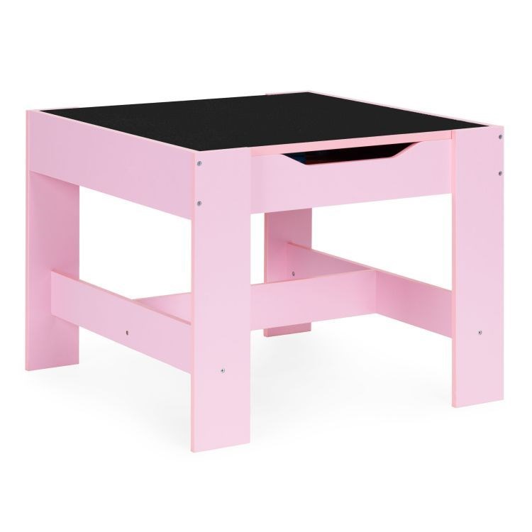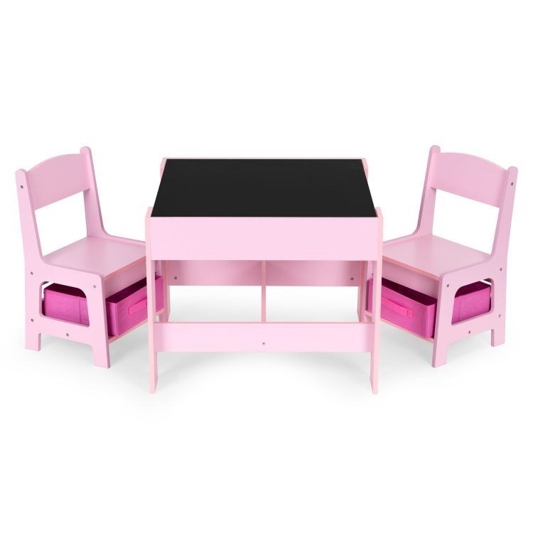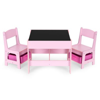 W skład kompletu wchodzą 2 krzesła i stolik. Zestaw posiada wytrzymałą i stabilną konstrukcję z płyty MDF. Stolik wyposażono w dwustronny, zdejmowany blat z tablicą kredową. Pod blatem znajduje się funkcjonalna przestrzeń do przechowywania klocków, zabawek lub innych drobiazgów. Pod siedziskami krzeseł umieszczono pojemne, tekstylne szufladki idealne do przechowywania zabawek. Komplet świetnie sprawdzi się w pokoju dziecięcym, salach zabaw czy poczekalniach.