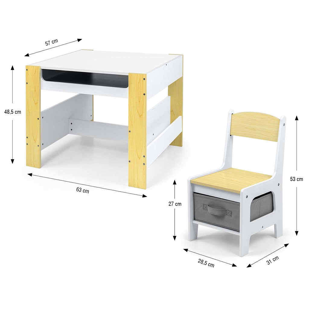 Zestaw wielofunkcyjnych mebli dla dzieci. Stolik SVEN z dwoma krzesełkami utrzymany w kolorystyce bieli i szarości z szarymi akcesoriami, wykonany z myślą o zapewnieniu dzieciom: wygody, przestrzeni do kreatywnej zabawy, malowania, pisania oraz zapewnieniu maksymalnego komfortu podczas zajęć. Zestaw zawiera 2 krzesełka z 2 tekstylnymi przybornikami do przechowywania chowanymi w półce pod krzesełkami. Stolik został wyposażony w ogromny schowek umieszczony pod dwustronnym wyjmowanym blatem. Posiada także boczne półki do przechowywania. Jedna strona blatu stolika to wielka tablica do rysowania. Krzesełka są lekkie i dzieci mogą je swobodnie przenosić. Meble wykonane są z wyjątkową precyzją i starannością. Oba krzesełka mają zaokrąglone rogi chroniące dziecko przed urazami. Wszystkie elementy konstrukcji stolika i krzesełek zapewniają wysoką stabilność i minimalizują ryzyko upadku. Zestaw Sven wykonany został z płyty MDF jest trwały i łatwy w pielęgnacji. Komplet mebli jest prosty do złożenia, a wszystkie elementy potrzebne do montażu zostały dołączone do zestawu.